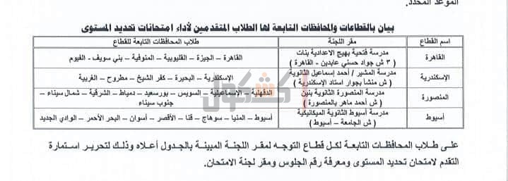 أعلنت وزارة التربية والتعليم والتعليم الفني، أماكن عن مقرات اللجان الامتحانية لاجراء امتحانات تحديد المستوى لطلاب ابناؤنا بالخارج.