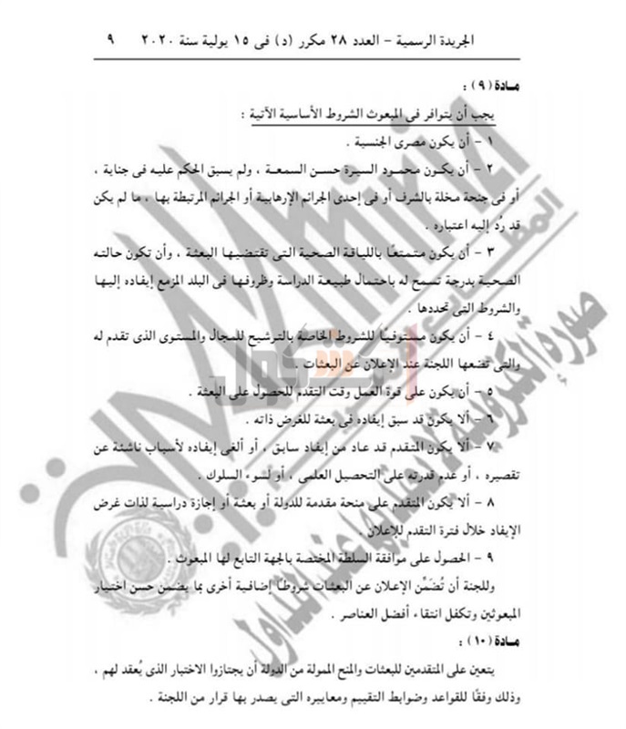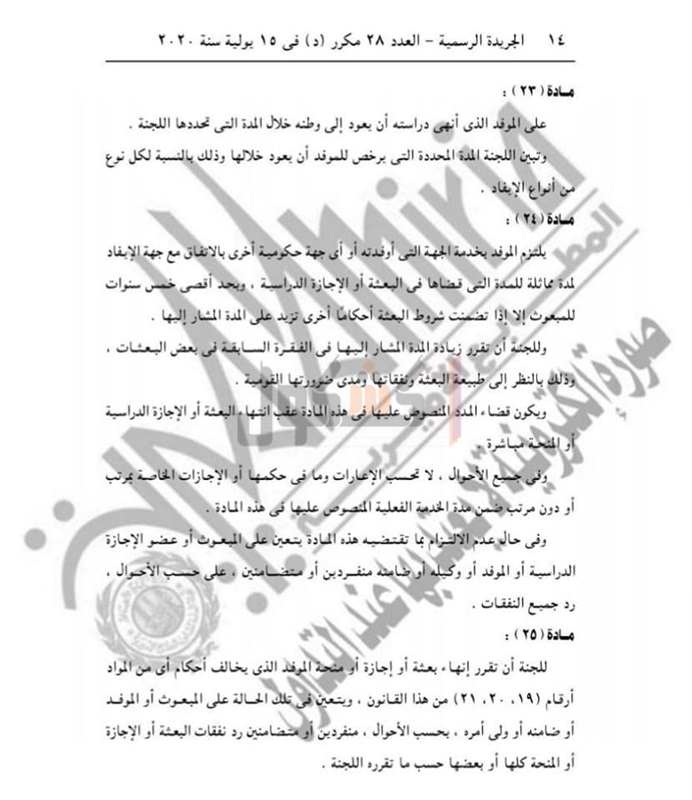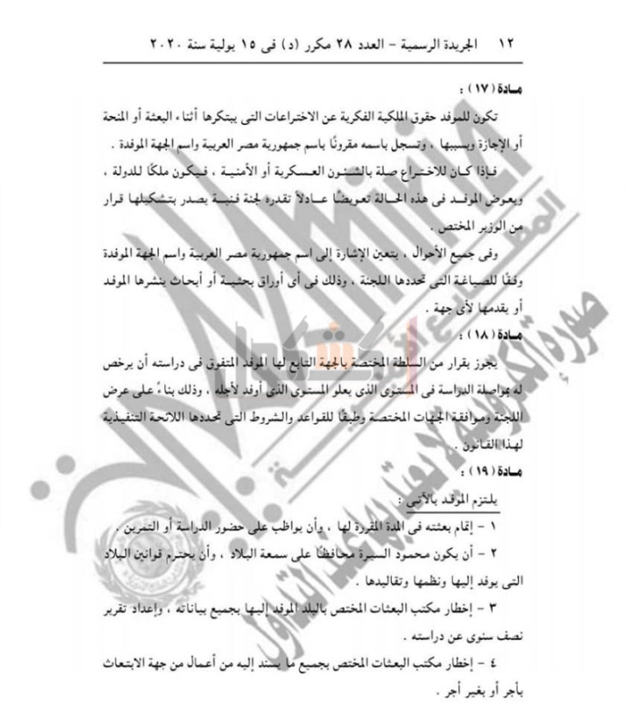 • إلزام الموفدين بالإشارة إلى اسم "جمهورية مصر العربية والجامعة الموفدة " عند نشر أبحاث جهة الابتعاث لضمان استفادة الدولة مما ينشره الموفدين من أبحاث أثناء فترة البعثة ورفع تصنيف الجامعات والمراكز البحثية المصرية في مؤشرات الأبحاث.