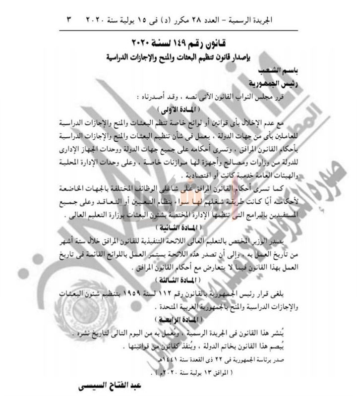 أعلن الدكتور خالد عبدالغفار وزير التعليم العالى والبحث، عن تصديق الرئيس عبدالفتاح السيسي على القانون رقم 149 لسنة 2020 بشأن تنظيم البعثات والمنح والإجازات الدراسية.