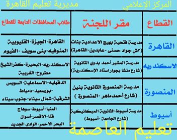 واكدت المديرية، انه يرجى التنبيه نحو توجيه الطلاب إلى القطاعات الموضح عناوينها بالجدول التالى طبقًا لمديرية كل طالب.