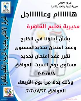 والتزام المديرية بتنفيذ التوجيهات لصالح أبنائنا الطلبة لذا تقرر عقد امتحان تحديد مستوى يوم السبت الموافق ٢٠٢٠/٨/٨ لطلاب أبناؤنا فى الخارج الذين اجتازوا المشروع البحثى للصف الثالث الاعدادي (أبناؤنا في الخارج) والراغبين فى التقدم للالتحاق بالصف الأول الثانوي ( عام-فنى )