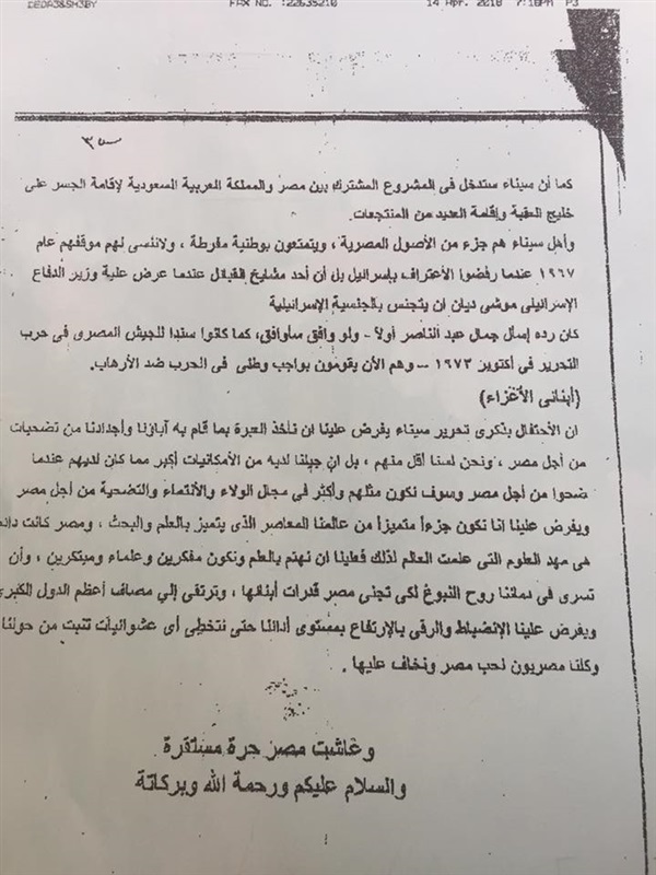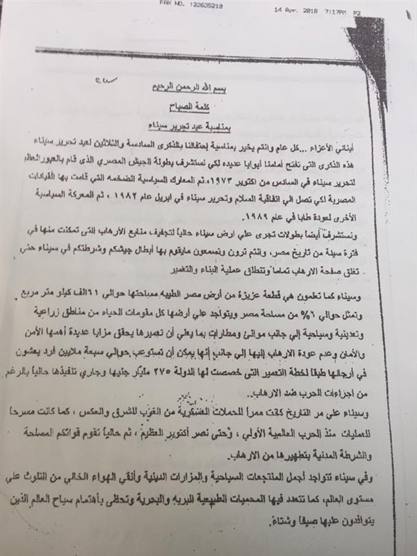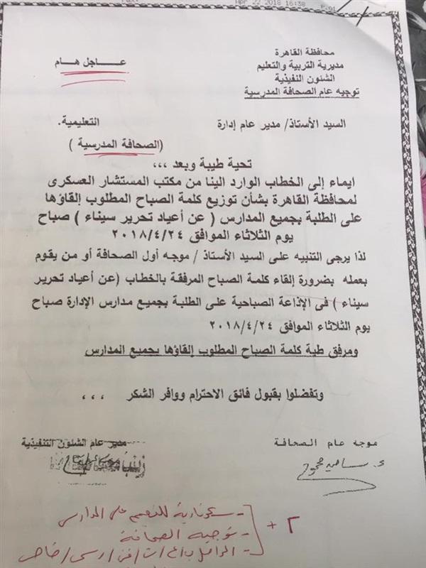 أو من يقوم بعمله بضرورة إلقاء كلمة الصباح المرفقه بالخطاب (عن أعياد تحرير سيناء)