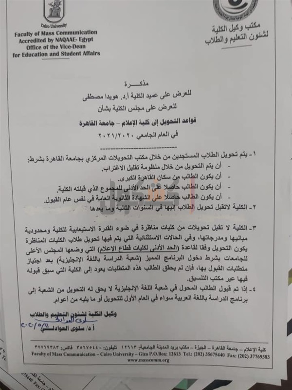 قدمت الدكتورة سلوى العوادلي وكلية كلية الإعلام جامعة القاهرة لشئون التعليم والطلاب مذكرة للعرض علي الدكتورة هويدا مصطفى عميدة الكلية وعلي مجلس الكلية بشأن قواعد التحويل إلى كلية الإعلام جامعة القاهرة للعام الجامعي ٢٠٢٠/٢٠٢١.
