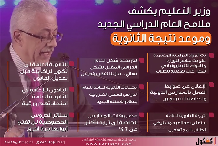 جراف انفوجراف.. وزير التعليم يكشف ملامح العام الدارسي الجديد وموعد نتيجة الثانوية شيماء منصور الأربعاء 22/يوليو/2020 - 12:19 م 7/22/2020 12:19:00 PM طباعة facebook twitter whats شارك