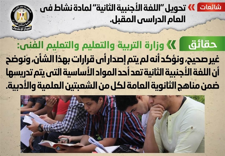 نفي المركز الإعلامي لرئاسة مجلس الوزراء، صحة ماانتشر عن تحويل" اللغة الأجنبية الثانية " لمادة نشاط في العام الدراسي المقبل.