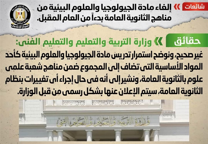 كشف المركز الإعلامي لرئاسة مجلس الوزراء، صحة ما انتشر حول الغاء مادة الجيولوجيا والعلوم البيئية من مناهج الثانوية العامة بدءاً من العام المقبل.