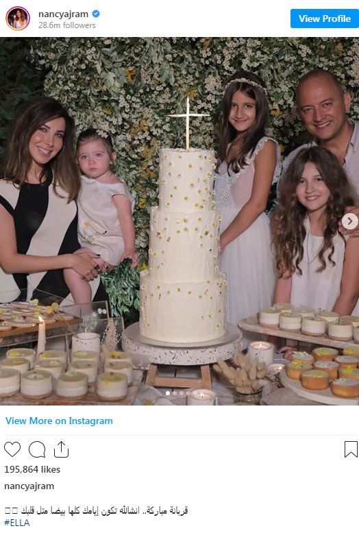 أحتفلت المطربة اللبنانية نانسي عجرم بأبنتها الثانية ، ونشرت مجموعة من الصور لها برفقة عائلتها احتفالًا بقربانة إبنتها إيلا، وذلك عبر حسابها الشخصى بموقع التواصل الاجتماعى لتبادل الصور والفيديوهات "إنستجرام".