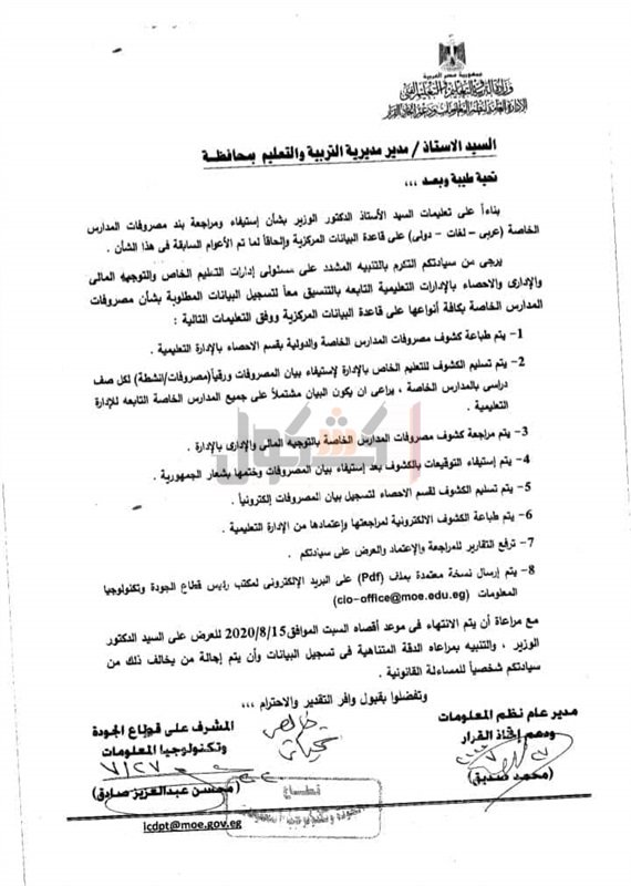 يتم الانتهاء في موعد اقصاه السبت 15 أغسطس 2020 للعرض علي الدكتور طارق شوقي وزير التربية والتعليم والتعليم الفني.