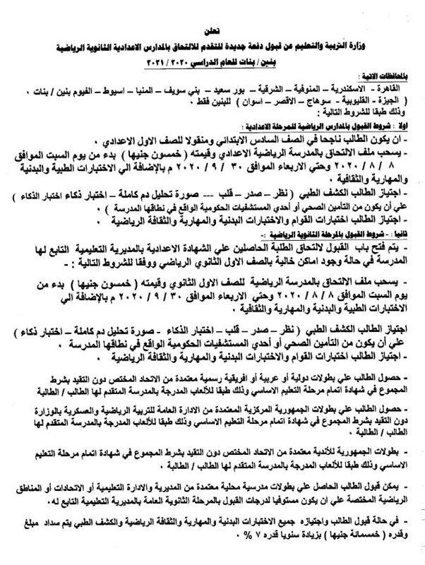 أعلنت وزارة التربية والتعليم والتعليم الفني، عن قبول دفعة جديدة للتقدم للالتحاق بالمدارس الإعدادية والثانوية الرياضية بنين وبنات للعام الدراسي 2020/2021.