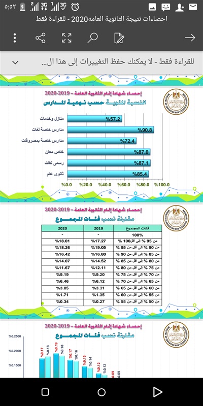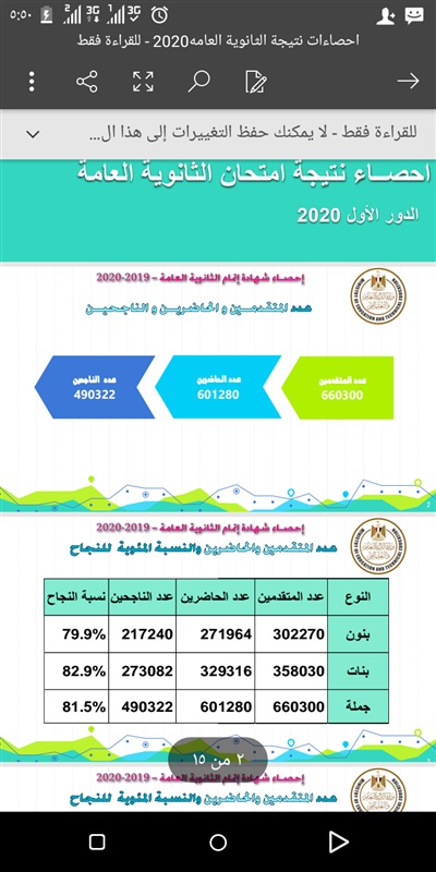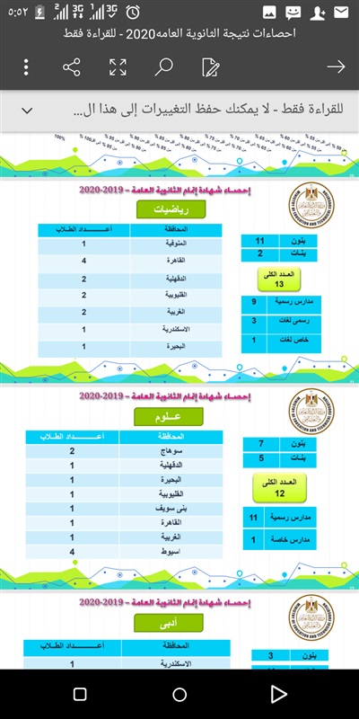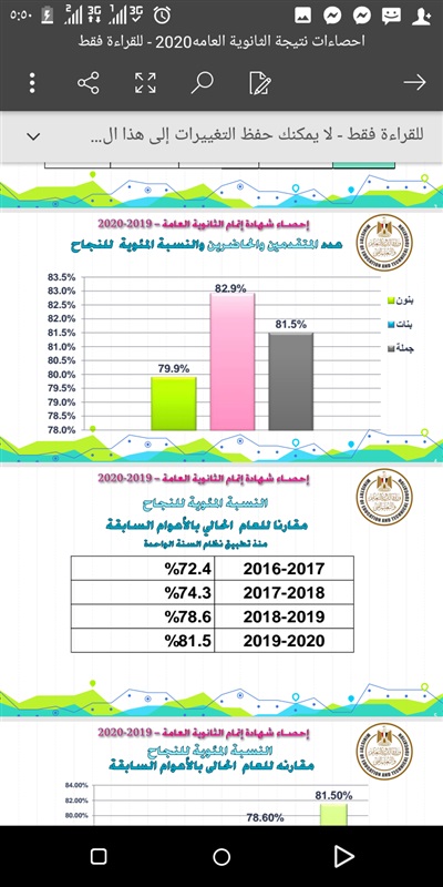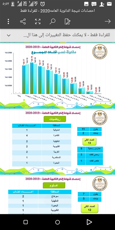 وأوضحت الاحصاءات ارتفاع نسبة النجاح في نتيجة الثانوية العامة 2020 العام الحالي عن الأعوام الثلاثة الماضية بنسبة نجاح 81%؛ وتصدرت محافظتي القاهرة والمنوفية قائمة الأوائل في الشعبة العلمية رياضة حيث ضمت قائمة الأوائل 11 من البنين و2 من البنات.
