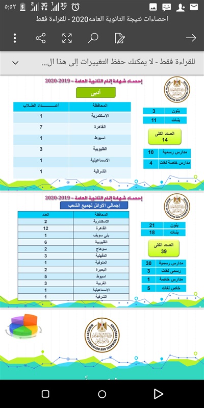 كشفت وزارة التربية والتعليم والتعليم الفني عن الاحصاءات الخاصة بـ نتيجة الثانوية العامة 2020 للعام الدراسي 2019/2020.