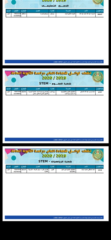 أما بالنسبة للطلاب المتقدمين لأداء امتحان الثانوية العامة بمدارس العلوم والتكنولوجيا (STEM) فقد حصل الطالب الأول على الشعبة العلمية علوم على مجموع 652.91، وحصل الطالب الأول على الشعبة العلمية رياضيات على مجموع 663.4.