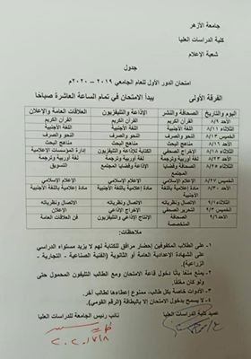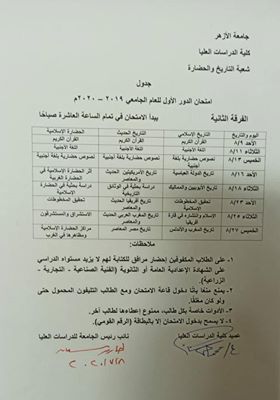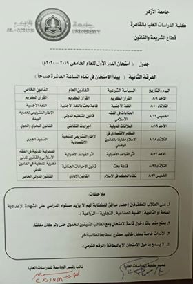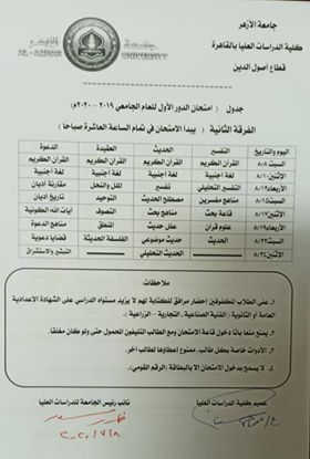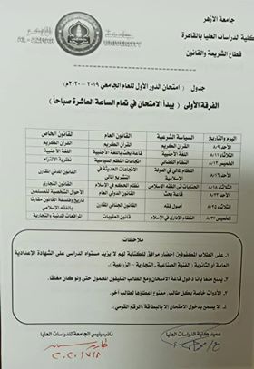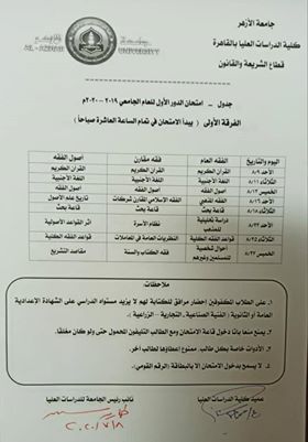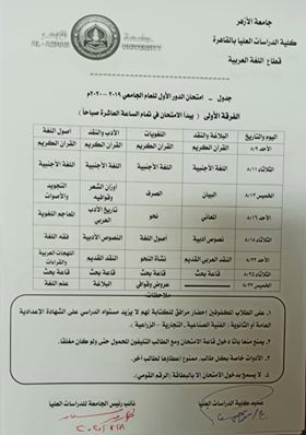 وجاءت جداول امتحانات جميع قطاعات كلية الدراسات العليا بالأزهر، كما يلي: