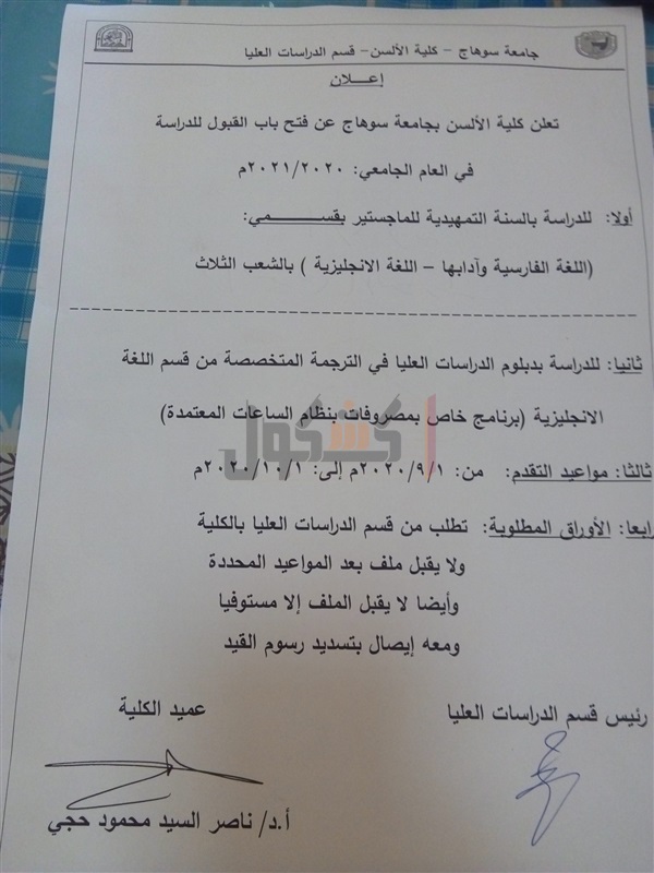 أعلنت كلية الألسن بجامعة سوهاج، عن فتح باب القبول للدراسة فى السنه التمهيدية للماجستير بقسمى اللغة الإنجليزية واللغة الفارسية، ودبلومة الترجمة المتخصصة بقسم اللغة الإنجليزية لعام 2021/2020.
