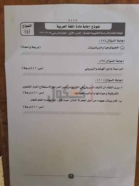 الإجابة النموذجية لامتحان اللغة العربية 2020