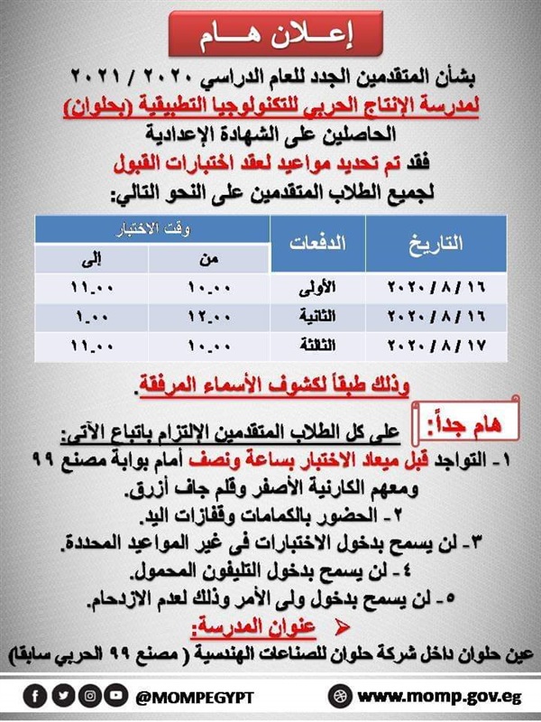 أصدرت وزارة الإنتاج الحربي، بيانا بشأن المتقدمين الجدد للعام الدراسي 2020 2021 لمدرسة الإنتاج الحربي للتكنولوجيا التطبيقية (بحلوان) الحاصلين على الشهادة الإعدادية، مشيرة إلى أنه تم تحديد مواعيد لعقد اختبارات القبول لجميع الطلاب المتقدمين.