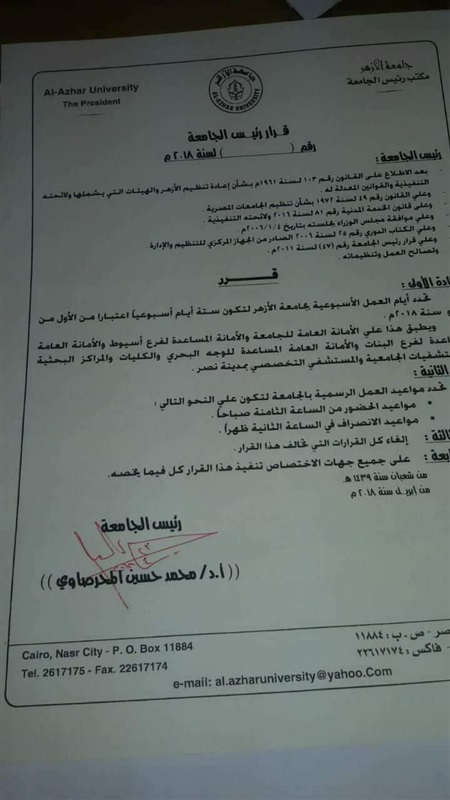 قرر الدكتور محمد المحرصاوي، رئيس جامعة الأزهر، أن يكون عمل الموظفين بالجامعة لمدة ٦ أيام في الأسبوع بعد أن كان يوم السبت إجازة رسمية.