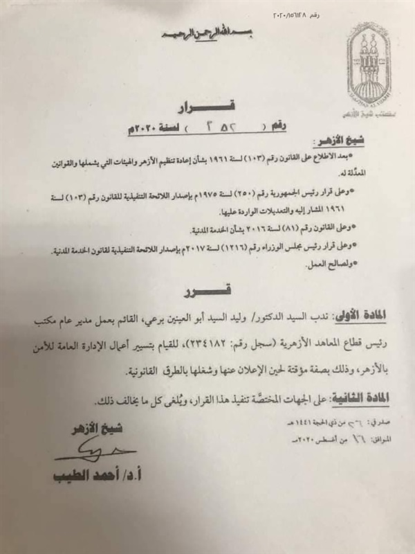 قرر فضيلة الإمام الأكبر الدكتور أحمد الطيب شيخ الأزهر، ندب وليد ابو العينين مدير مكتب رئيس قطاع المعاهد الأزهرية رئيساً للإدارة المركزية للأمن بمشيخة الأزهر.