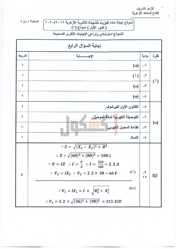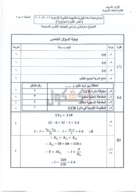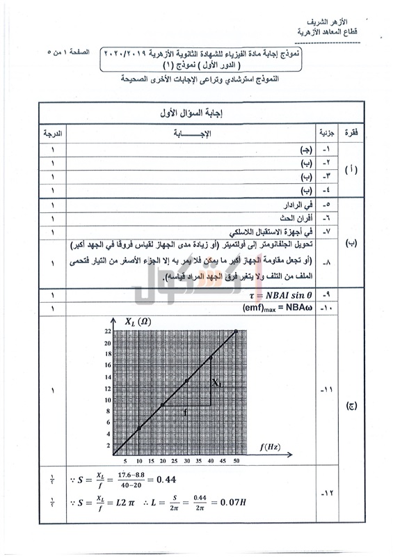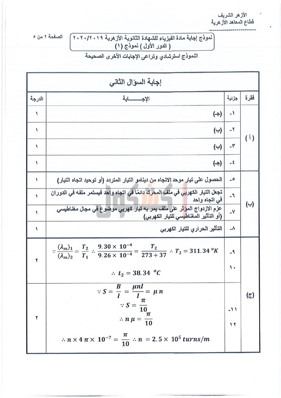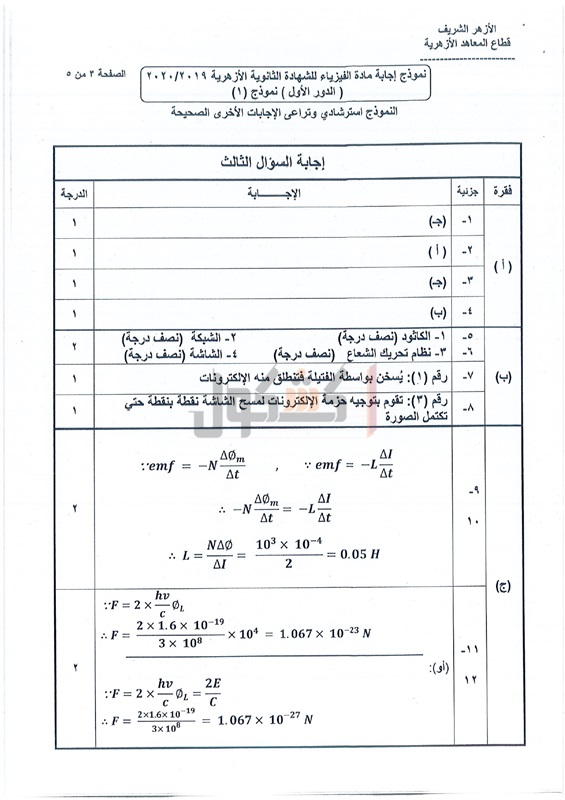 الإجابة النموذجية لامتحان الفيزياء لطلاب العلمي بالثانوية الأزهرية