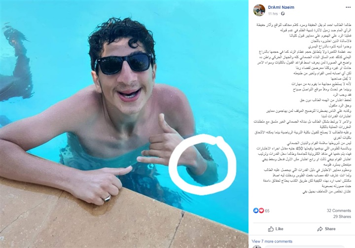 التربية الرياضية بينما يمكنه الالتحاق بكليات أخري، ليس من شروطها سلامة القوام والبنيان الجسماني، وبالنسبة للفلوس اللي بيدفعها وقيمتها 450 جنيه مقابل اجراء الاختبارات