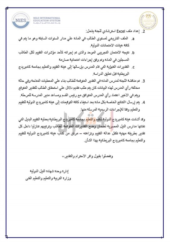 وأشادت هيئة كامبريدج الدولية بعملية التقييم البديل التي نفذتها مدارس النيل المصرية، امتحان وضع التقديرات المتراكمة للطلاب وترتيبهم تنازليا داخل كل تقدير بطريقة مهنية تكفل عدالة التقييم ونزاهته.