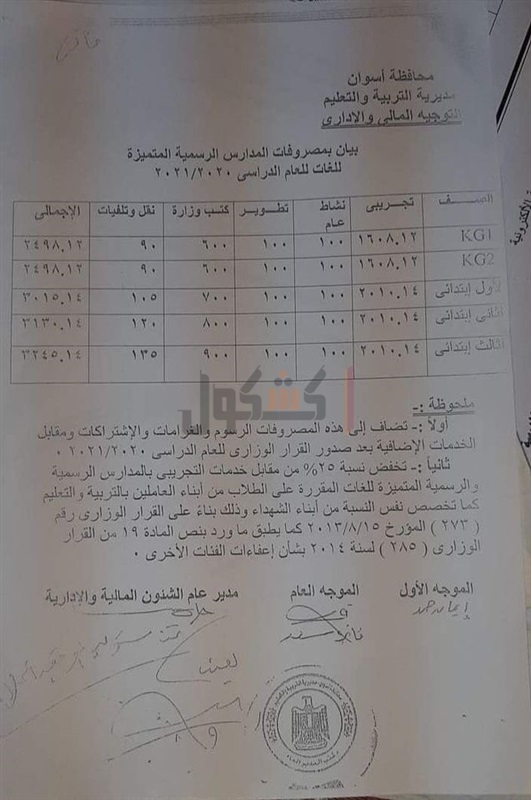 الفني بمحافظة أسوان بيان بمصروفات المدارس الرسمية المتميزة للغات للعام الدراسي 2020/2021.