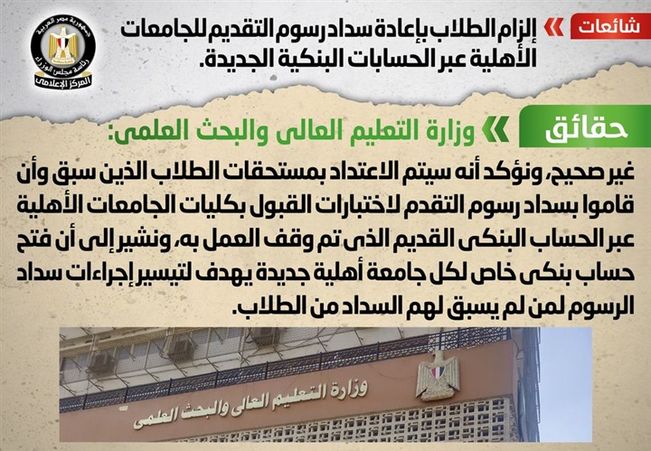 نفى المركز الإعلامي لمجلس الوزراء، ما تداولته بعض وسائل الإعلام والمواقع الإلكترونية وصفحات التواصل الاجتماعي من أنباء بشأن إلزام الطلاب بإعادة سداد رسوم التقديم للجامعات الأهلية عبر الحسابات البنكية الجديدة.