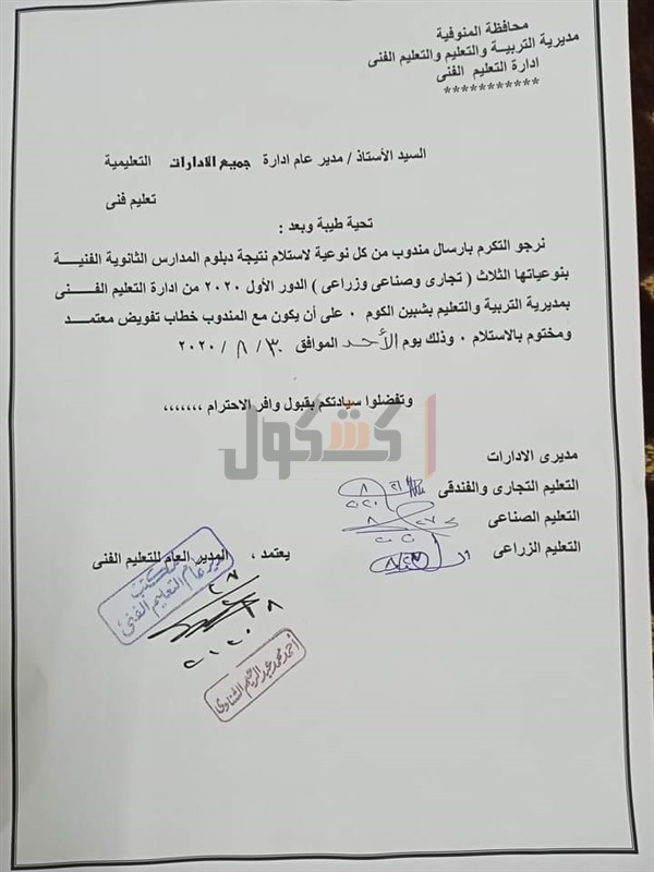 وجهت وزارة التربية والتعليم والتعليم الفني خطاب للمديريات التعليمية شددت خلاله علي ضرورة إرسال متدرب من كل نوعية لاستلام نتيجة دبلوم المدارس الثانوية الفنية بنوعياتها الثلاثة (صناعي/زراعي/تجاري/فندقي) للدور الأول 2020 .