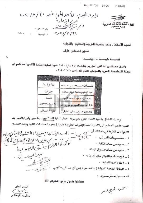 أرسلت إدارة الاعارات الخارجية خطابات مسجلة إلي مديريات التربية والتعليم التي يعمل بها الأسماء المرشحة لسرعة الانتهاء من الإجراءات المطلوبة منهم.