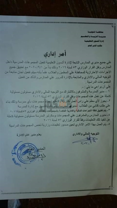 أصدرت مديرية التربية والتعليم في المنوفية أمر إداري شددت خلاله على جميع مديري المدارس تفعيل المجموعات المدرسية داخل المدارس بدءا من 1 سبتمبر 2020 مع تطبيق الإجراءات الاحترازية اللازمة للوقاية من كورونا.