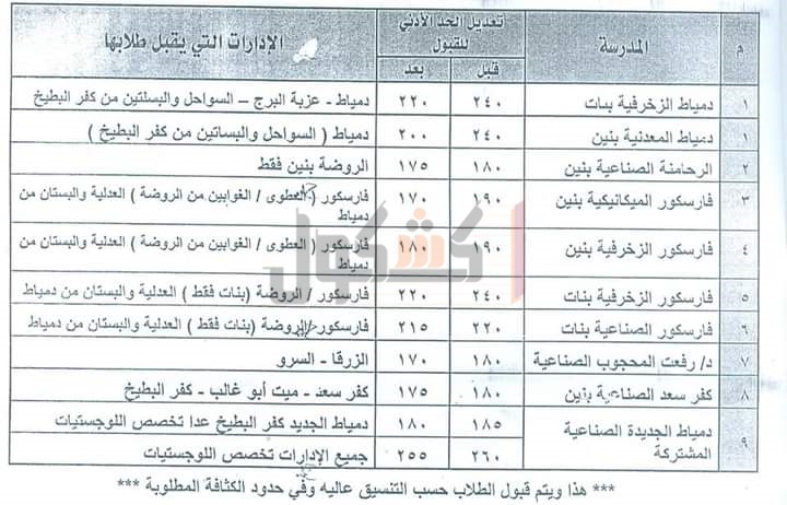 إعتمدت الدكتورة منال عوض محافظ دمياط، تنسيق القبول بمدارس التعليم الفنى للعام الدراسى ٢٠٢١/٢٠٢٠ وذلك للطلاب الحاصلين على شهادة إتمام مرحلة التعليم الأساسى و ذلك وفقًا لما هو موضح بالجداول المرفقة..