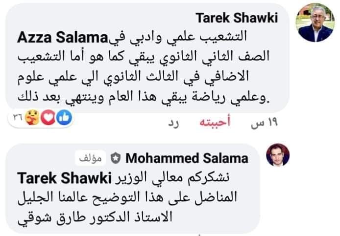 أكد الدكتور طارق شوقي وزير التربية والتعليم والتعليم الفني، أن التشعيب في علمي وأدبي يبقي كما هو في الصف الثاني الثانوي.