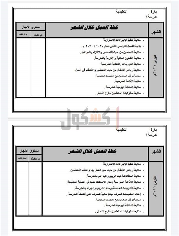وشددت علي ضرورة متابعة سلوكيات المتعلمين خارج الفصل بالاضافة الي متابعة الاذاعة المدرسية وموقف الكتب والانشطة أيضا، وأشارت الخطة الي عمل تقويمات شهرية للمتعلمين بالاضافة الي متابعة النظافة في المدرسة أول بأول.