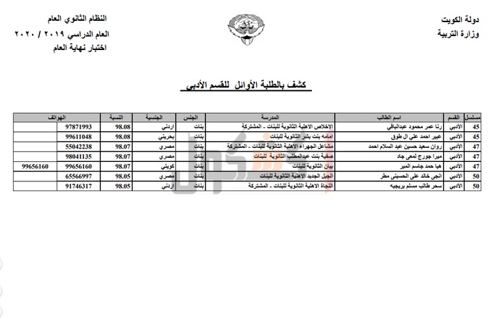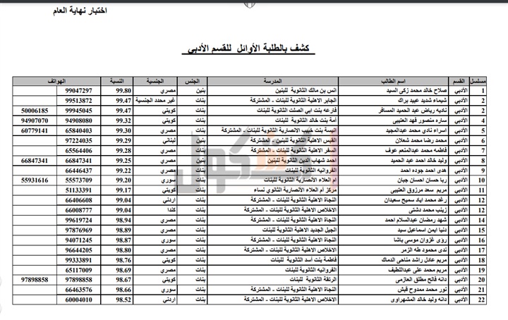 وبالنسبة للقسم الأدبي، حصل الطالب صلاح خالد محمد ذكي السيد، مدرسة أنس بن مالك، على المركز الأول بمجموع 99.80%، وإسراء نادي محمد عبدالمجيد، مدرسة أنيسة بنت خبيب الأنصارية، في المركز الخامس بمجموع 99.30%، وفاطمة محمد عبدالمنعم عوف، مدرسة السفر الأهلية في المركز السابع بمجموع 99.28%، ووليد خالد أحمد عبدالمجيد، مدرسة أحمد شهاب الدين، في المركز الثامن بمجموع 99.25%، وهدى أحمد جوده أحمد، مدرسة الفروانية الثانوية، في المركز التاسع بمجموع 99.22%.