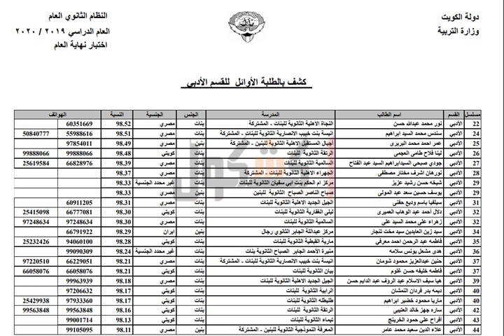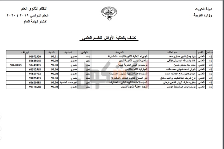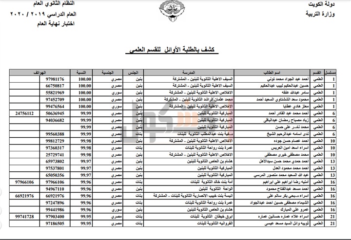 أعلن قبل قليل، وزير التربية ووزير التعليم العالي د سعود الحربي، نتيجة الثانوية العامة بالكويت النهائية، وتصدر طلاب الثانوية العامة المصريين القائمة حيث بلغ عدد المصريين الأوائل في الكويت 70 مصري