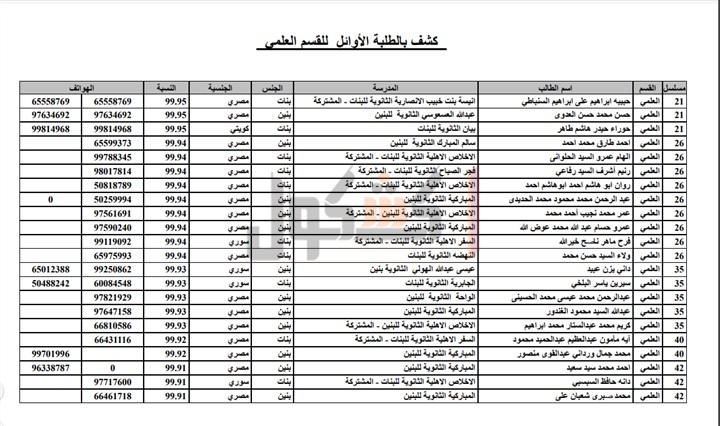 وبلغ عدد الطلاب المصريين الأوائل للقسم العلمي 43