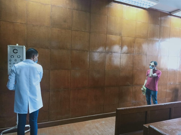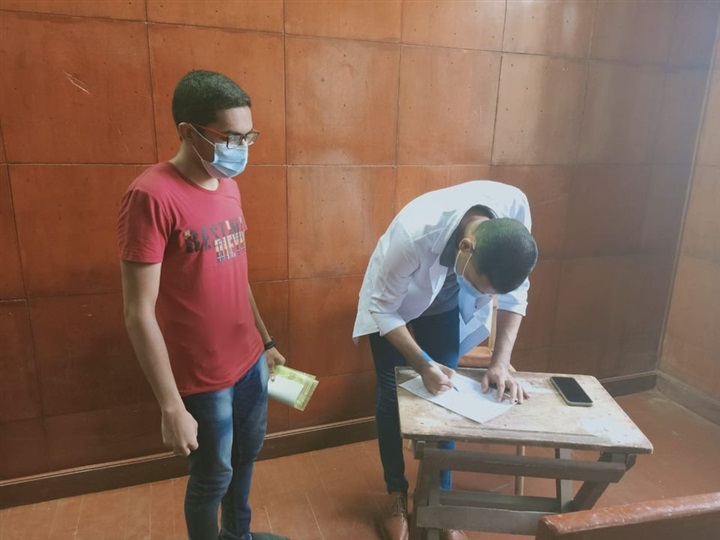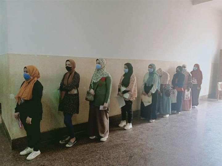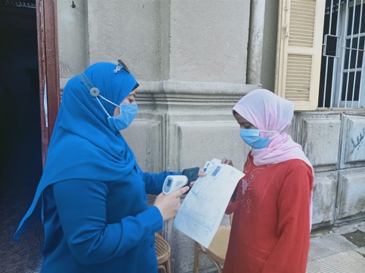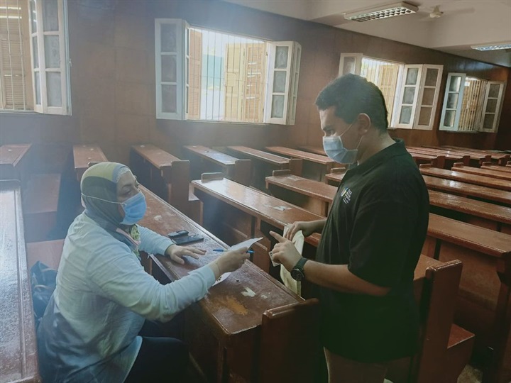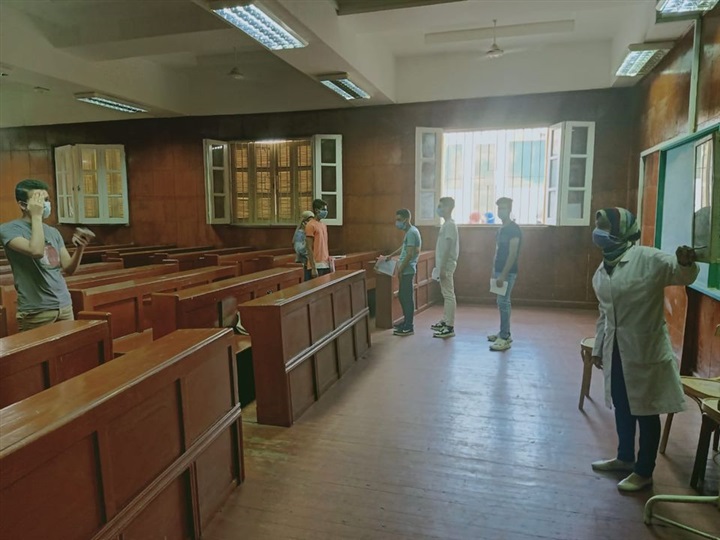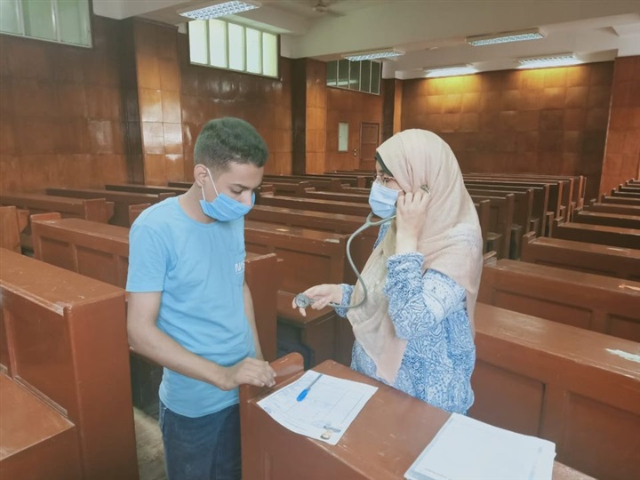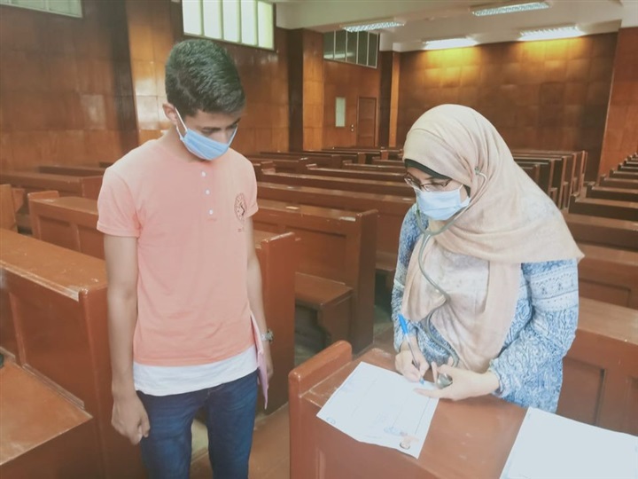 بحضور عدد من الأطباء والتمريض بمدرجات كلية الحقوق حيث يتم قياس درجات الحرارة للطلاب
