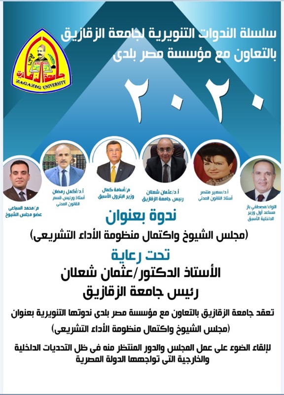 تنظم جامعة الزقازيق الندوة التثقيفية بعنوان" مجلس الشيوخ وإكتمال منظومة الأداء التشريعى "، تحت رعاية الدكتور عثمان شعلان رئيس الجامعة، وبالتعاون مع مؤسسة جبهة مصر بلدى، وذلك يوم الأربعاء المقبل 23 سبتمبر ٢٠٢٠ في تمام الساعة الواحدة ظهراً عبر تقنية الفيديو كونفرانس.