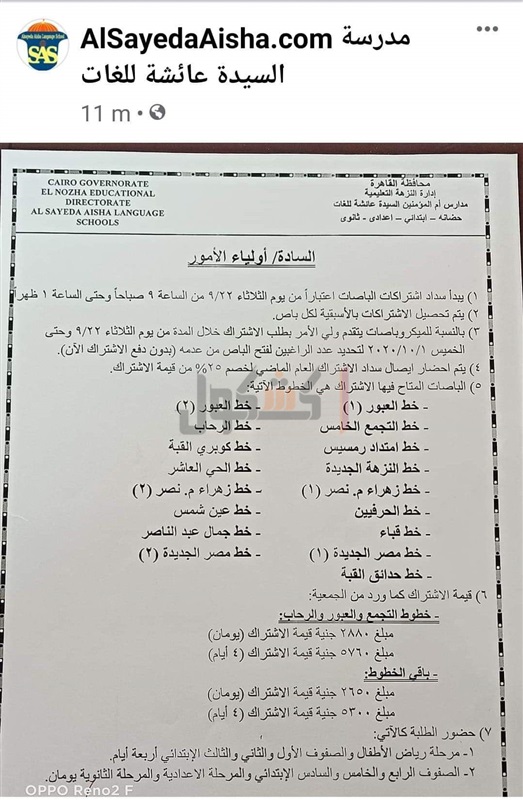 تجدر الاشارة إلى أن مدرسة السيدة عائشة للغات التابعة لإدارة النزهة التعليمية أكدت خلال بيان لها أن مبلغ 2880 لمن يذهب يومان، بينما مبلغ 5760 قيمة إشتراك الباص لمن يذهب 4 أيام.