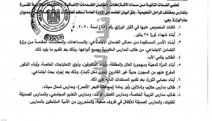 قررت وزارة التربية والتعليم والتعليم، إعفاء عدة فئات من الغرامات والاشتراكات والأنشطة الطلابية والفئات التي تستحق الخصم.