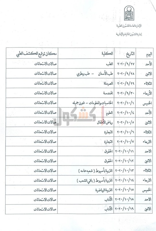 /10 لطلاب كلية التجارة، وتم تحديد يومي الأحد والاثنين 11و12 /10 لطلاب كلية الحقوق،