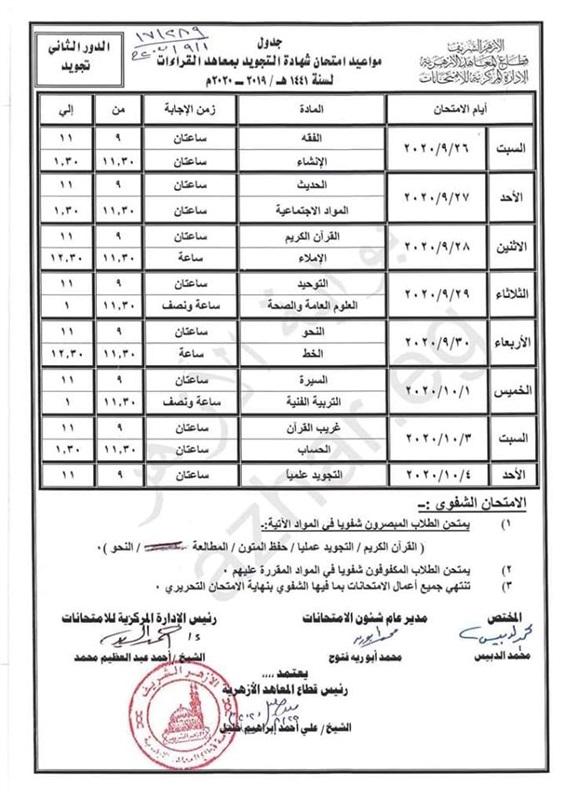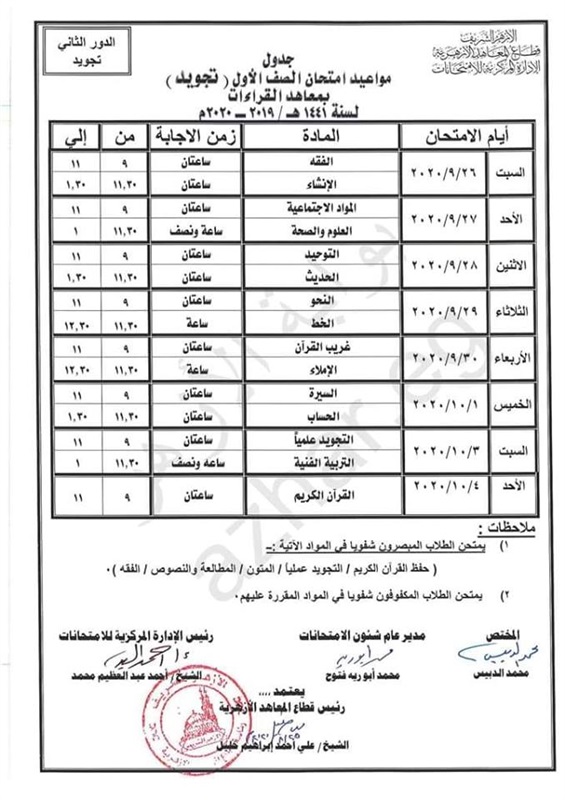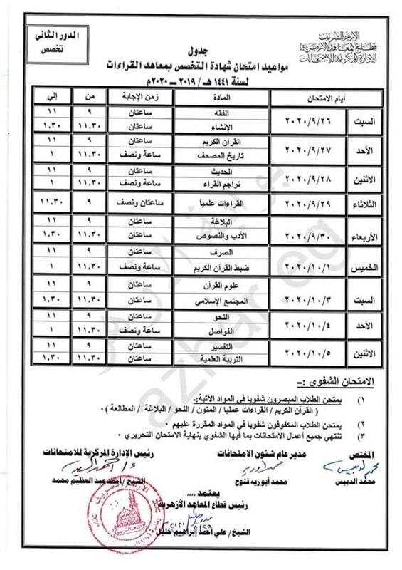 ننشر جداول ومواعيد امتحانات الدور الثاني لشهادات القراءات بالأزهر