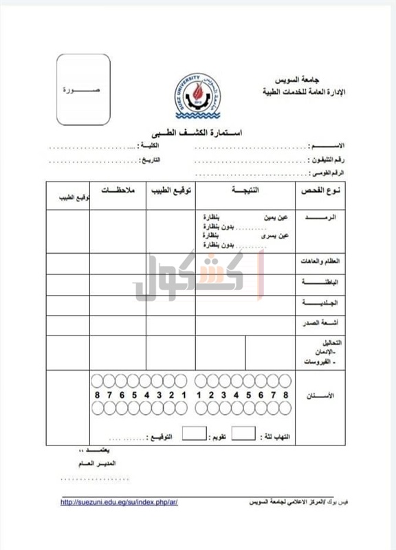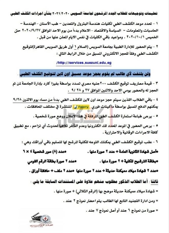 بجامعة السويس (السلام 1 أول طريق السويس القاهرة) لتوقيع الكشف الطبي وفقاً للحجز
