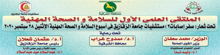 تنطلق فعاليات الملتقى العلمى الأول للسلامة والصحة المهنية تحت شعار (صفر إصابات 2) والذي تنظمه مستشفيات جامعة الزقازيق، تحت رعاية وحضور الوزير محمد سعفان وزير القوى العاملة، والدكتور ممدوح غراب محافظ الشرقية، والدكتور عثمان شعلان رئيس الجامعة، وذلك في إطار الاحتفال بأسبوع السلامة والصحة المهنية، يوم الإثنين المقبل الموافق 28 سبتمبر، بالمركز العلمى بكلية الطب قاعة أ.