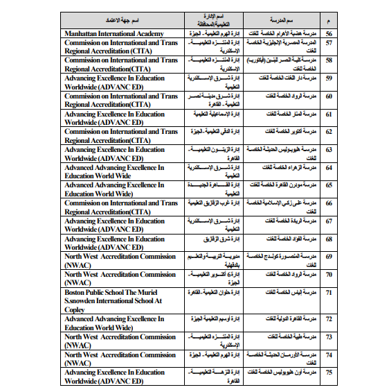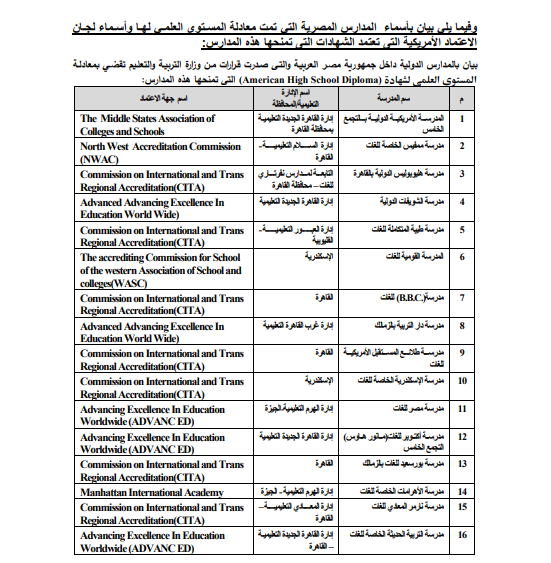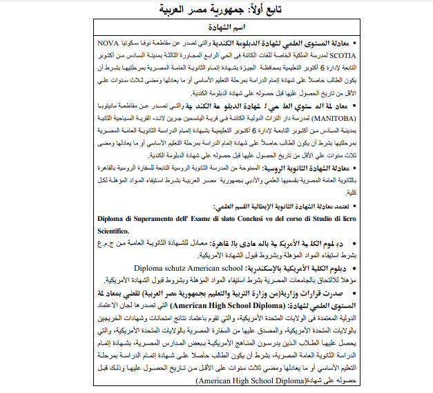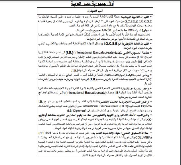 بيان بالشهادات العربية والأجنبية المعادلة بالثانوية العامة المصرية