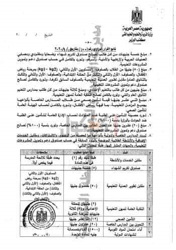 وتحصل المدارس الخاصة والدولية مبلغ 50 جنيها من الطلاب بصفوف رياض الاطفال والأول والثاني والثالث من الحلقة الابتدائية والصفوف الأول والثاني والثالث بالثانوي العام مقابل تطوير العملية التعليمية بالصفوف السابق ذكرها، على أن تورد بالكامل لصالح صندوق دعم وتمويل المشروعات التعليمية.