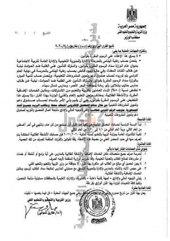 حيث نص القرار على أن تحصل المدارس الخاصة والدولية مبلغ 5 جنيهات من كل طالب، لصالح صندوق تكريم شهداء وضحايا ومفقودي ومصابي العمليات الحربية والارهابية والأمنية وأسرهم، على أن تورد بالكامل في حساب صندوق دعم وتمويل المشروعات التعليمية.