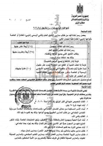 وكذلك تحديد الرسوم والغرامات والاشتراكات ومقابل الخدمات الإضافية التي تحصل من طلاب وطالبات المدارس بمختلف مراحل التعليم العام والفني للعام الدراسي 2020/2021.