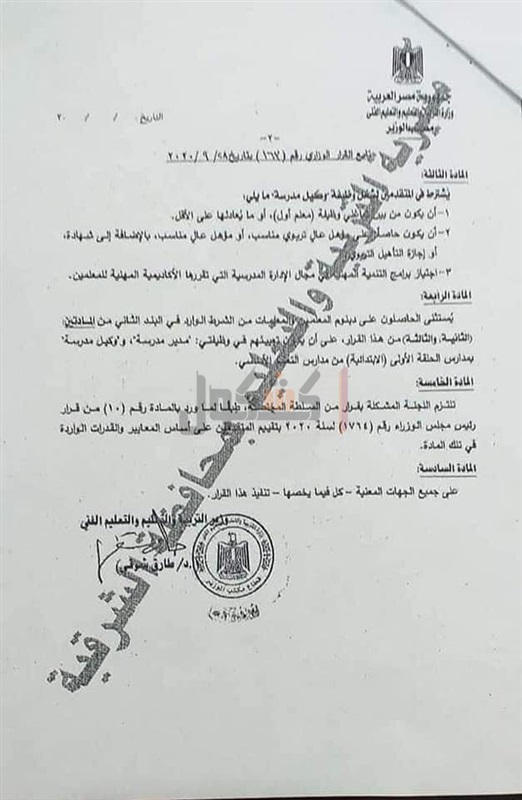 قررت وزارة التربية والتعليم استثناء الحاصلين على المعلمون والمعلمات الشروط المتعلقة بالتقدم لوظائف مديري ووكلاء المدارس، التي أعلنت عنها الوزارة بمدارس الحلقة الأولى من مدارس التعليم الأساسي.