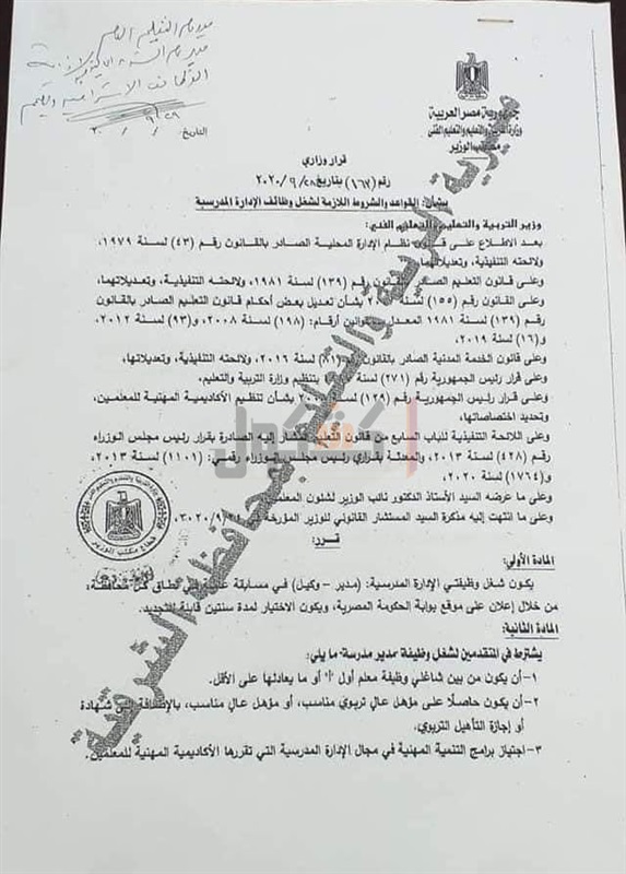 بشأن شغل الوظائف القيادية المدرسي الذي حددته خلاله وزارة التعليم أن يكون المتقدم